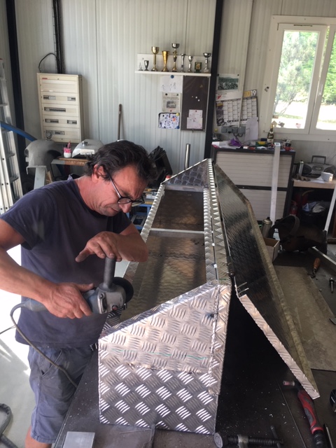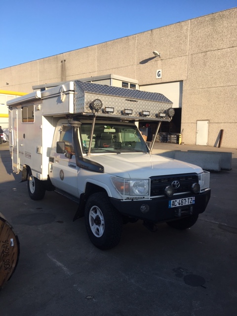 L’ajout de coffres aluminium extérieurs supportant à l’avant une rampe de phares LEDs a été réalisé avec une immense patience par Philippe (https://stephan-concept.fr/) qui a su malgré nos tâtonnements accommoder toutes nos demandes (y compris lorsque après avoir terminé le montage des coffres nous lui avons demandé de les agrandir de manière substantielle). Philippe a également apporté de nombreuses autres améliorations, couvrant tout à la fois la protection de la carrosserie : protèges phares métalliques thermolaqués, que la production et installation d’une ligne d`échappement inox (photos).