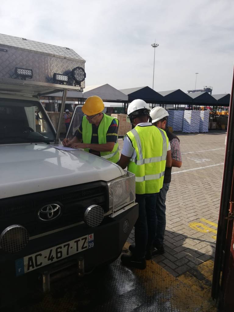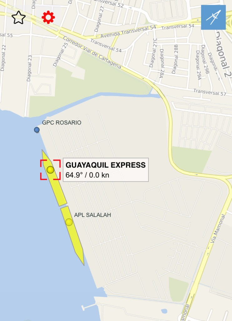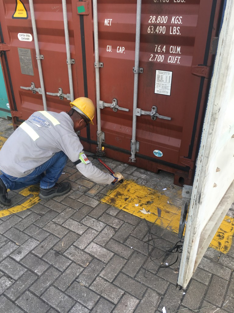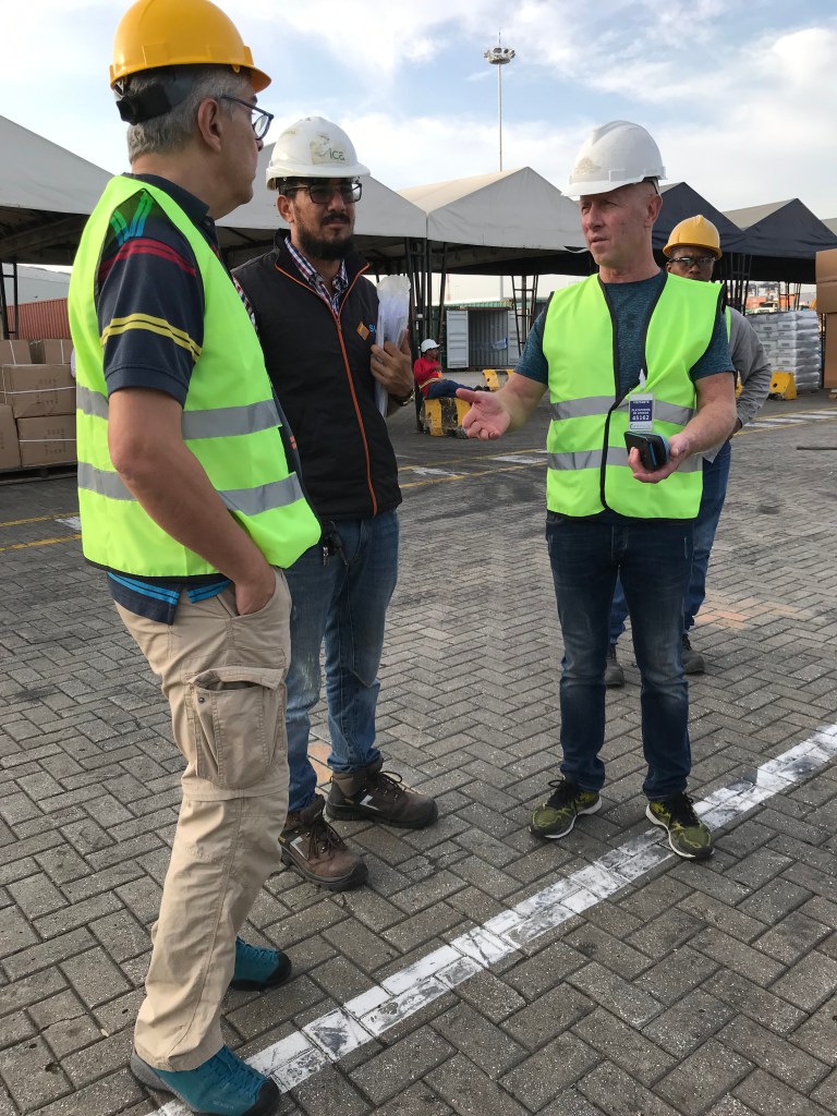 Tout cela ne nous fait pas oublier la raison de notre présence qui s’éternise un peu trop à notre goût. En effet arrivés le 2 décembre, nous avons dès le lendemain eut le plaisir d’apprendre que le Guayaquil Express venait d’arriver au port dans la soirée (photo du tracker) et que son déchargement était prévu dès le lendemain. C’est donc avec excitation que nous avons rejoint Julio l’agent transitaire à son bureau pour la préparation des papiers administratifs nécessaires à notre présence sur le port lors de l’ouverture du conteneur prévue pour le lendemain 6 hr du matin au port. Point de détail sur l’administratif en Colombie, la procuration (poder) établie au nom de notre transitaire lui permettant d’effectuer les démarches en douane et au port en notre nom devant être validée par un notaire, cela nous a pris 10 minutes et 3 euros en nous présentant à l’officine de ce dernier sans RDV, on aimerait parfois que les démarches notariales soient aussi accessibles à tous, rapides et bon marché dans nos belles régions françaises.Puis il nous a fallu acheter une assurance individuelle nous permettant de pénétrer l’enceinte sous douane du port. Rendez vous pris pour le lendemain matin à 6:00 tapantes a l’entrée du port, où il fallut montrer patte blanche et c’est ainsi qu’équipés de pantalons longs, chaussures fermées, d’un gilet jaune fluorescent (eh oui on le porte également en Amérique du sud !) et d’un joli casque de chantier nous avons pu pénétrer sur le port. Je vous confirme que paré de tous ces atours après deux heures d’attente sous le soleil on a plutôt l’impression de porter un short de sudation au milieu d’un hammam!, c’est du reste l’occasion pour certains de faire une petite sieste.