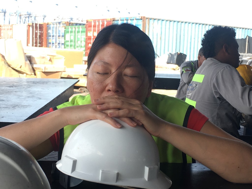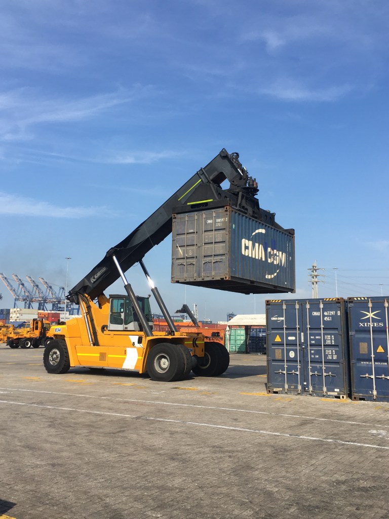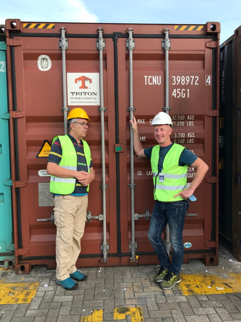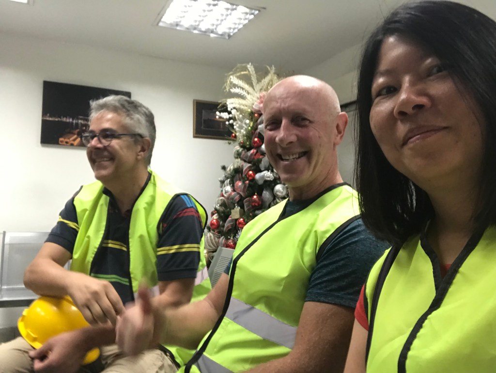 Tout cela ne nous fait pas oublier la raison de notre présence qui s’éternise un peu trop à notre goût. En effet arrivés le 2 décembre, nous avons dès le lendemain eut le plaisir d’apprendre que le Guayaquil Express venait d’arriver au port dans la soirée (photo du tracker) et que son déchargement était prévu dès le lendemain. C’est donc avec excitation que nous avons rejoint Julio l’agent transitaire à son bureau pour la préparation des papiers administratifs nécessaires à notre présence sur le port lors de l’ouverture du conteneur prévue pour le lendemain 6 hr du matin au port. Point de détail sur l’administratif en Colombie, la procuration (poder) établie au nom de notre transitaire lui permettant d’effectuer les démarches en douane et au port en notre nom devant être validée par un notaire, cela nous a pris 10 minutes et 3 euros en nous présentant à l’officine de ce dernier sans RDV, on aimerait parfois que les démarches notariales soient aussi accessibles à tous, rapides et bon marché dans nos belles régions françaises.Puis il nous a fallu acheter une assurance individuelle nous permettant de pénétrer l’enceinte sous douane du port. Rendez vous pris pour le lendemain matin à 6:00 tapantes a l’entrée du port, où il fallut montrer patte blanche et c’est ainsi qu’équipés de pantalons longs, chaussures fermées, d’un gilet jaune fluorescent (eh oui on le porte également en Amérique du sud !) et d’un joli casque de chantier nous avons pu pénétrer sur le port. Je vous confirme que paré de tous ces atours après deux heures d’attente sous le soleil on a plutôt l’impression de porter un short de sudation au milieu d’un hammam!, c’est du reste l’occasion pour certains de faire une petite sieste.