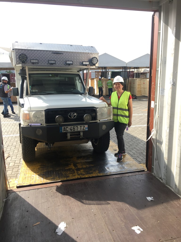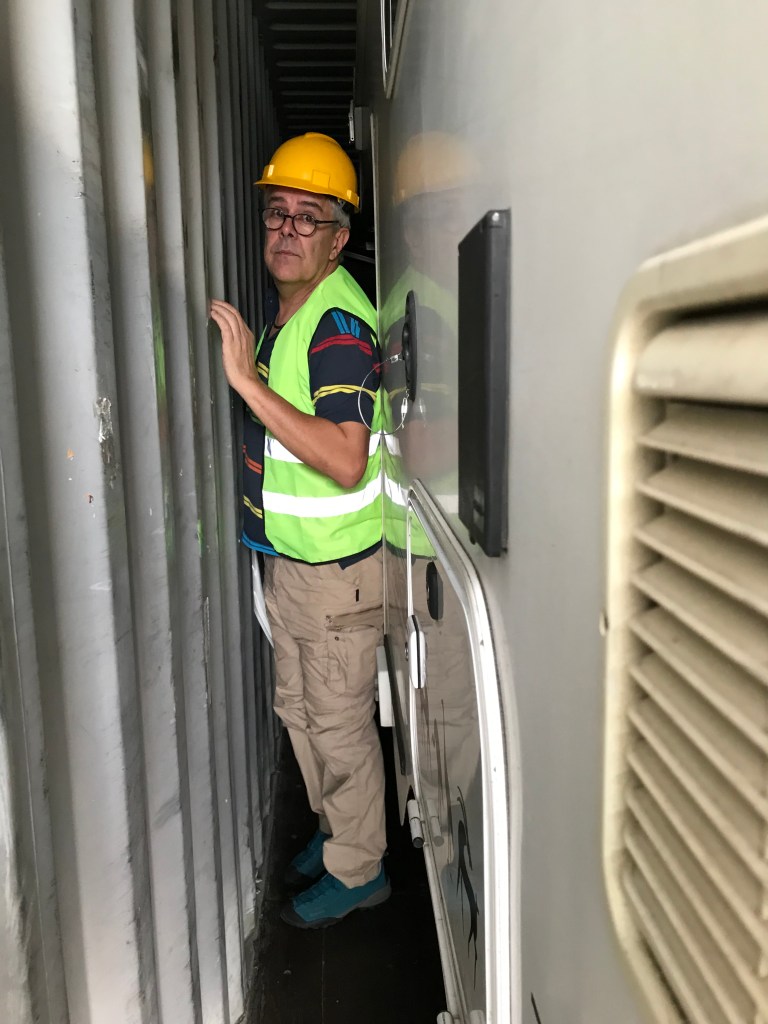 Puis le moment tant attendu arrive : l’inspecteur des douanes est là on va enfin pouvoir casser le scellé et procéder au contrôle. Ça c’est la théorie car tout ne se passe jamais comme prévu, la batterie n’ayant pas été débranchée pour la traversée elle est totalement vide, donc impossible de sortir Tommy sans une batterie qui doit arriver ‘ahorita` (dans l’instant) et qui de fait arrivera à 10:00 suivi de l’inspecteur 30minutes plus tard. L’inspection est ultra simple on vérifie que le numéro de châssis et bien celui indiqué sur la carte grise et basta ! rien sur les marchandises transportées. On remet le tout dans le même conteneur un nouveau plombage et maintenant on attend que l’inspecteur rende son verdict par écrit au transitaire. Là on croit que c’est sûr on aura le papier cette après-midi qui va nous permettre de souscrire en ville l’assurance routière (SOAT) sans laquelle impossible de prendre la route. Les heures passent et fin d’après-midi ce jeudi rien pas de confirmation ☹, bon ce sera pour demain ! De plus Julio nous l’a promis nous serons sur la route au plus tard samedi……..eh! bien une fois encore le sort en a voulu autrement : non seulement nous avons reçu le document de l’inspecteur trop tard vendredi après-midi pour souscrire ladite SOAT qu’il ne sera possible d’obtenir que lundi a partir de 7:00 du matin. Entre temps on croise les doigts pour que les autorités du port donnent leur feu vert pour que le conteneur soit enfin sorti du port et transféré à l’entrepôt du transitaire afin que nous puissions enfin reprendre possession de Tommy et que Milou puisse se dégourdir un peu les pattes !
