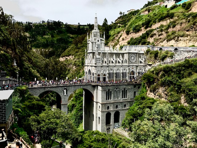 The last hundred or so kilometers down to the border was slow going due to extensive roadworks. The reward was a spectacular view of the sanctuary of Las Lajas, built over a canyon and river. Sunday is the traditional pilgrimage day and there were hundreds of devoted visitors at the site.