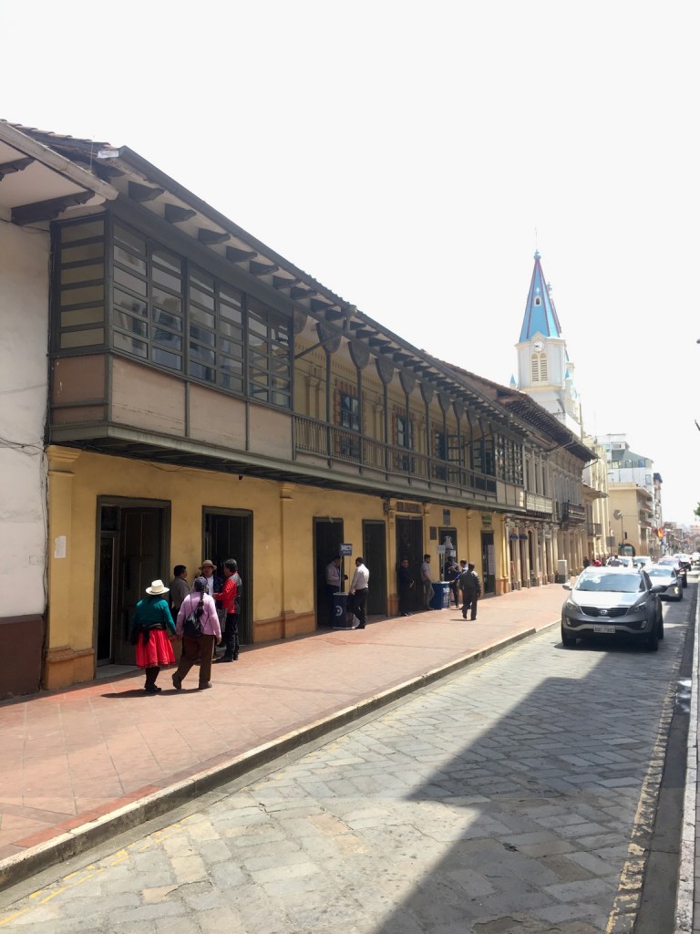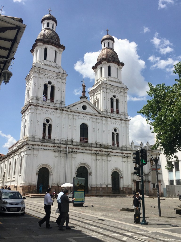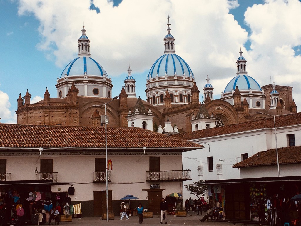 Cuenca est située dans la sierra Equatorienne, l’architecture coloniale est encore bien visible dans le vieux Cuenca avec les balcons en bois des étages des vielles maisons bourgeoises. En déambulant dans les rues du centre on sent une ville prospère où les différentes composantes de la population semblent se côtoyer sans problème majeur. On y rencontre aussi bien les femmes Quechua portant le costume traditionnel avec leur longues tresses noires surmontées du chapeau de feutre (façon Borsalino), que le descendant hispanique en costume trois pièces sortant de son officine ou l’étudiant avec sa sacoche sous le bras. La ville fourmille de petits cafés restaurants ou on vous servira un menu del dia avec soupe maison maïs yucca et poulet, plat principal composé de riz, porc grillé et petite salade mixte le tout arrosé d’un pichet de citronnade maison pour la modeste somme de 2.5 $ US par personne. Les deux cathédrales qui se font face autour du Parc Calderon ont une histoire peu banale, l’ancienne étant à l’origine une église (El Sagrario) sa construction commença en 1557 et financée par de riches familles abritait également un monastère et fut appelée cathédrale lorsque la nouvelle (Immaculada Conception) plus récente qui devait être sans conteste la plus belle la plus haute la plus imposante fut achevée. Car malheureusement une erreur majeure de l’architecte dans son design ne permit de construire les deux tours à la hauteur initialement prévue l’édifice ne permettant pas de supporter le poids de ses dernières (tout le monde peut se tromper !)