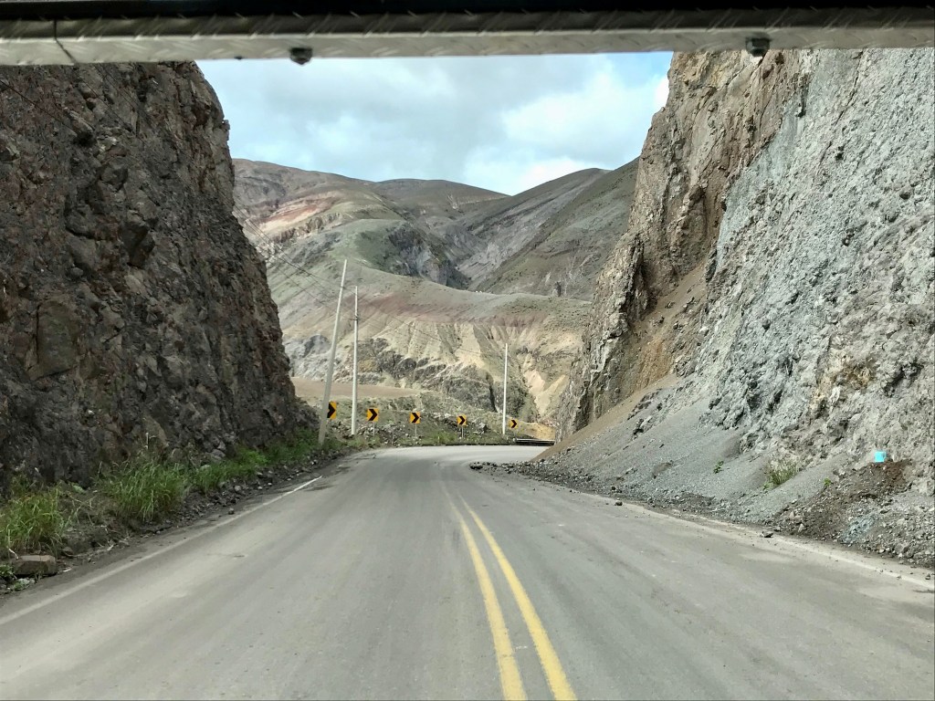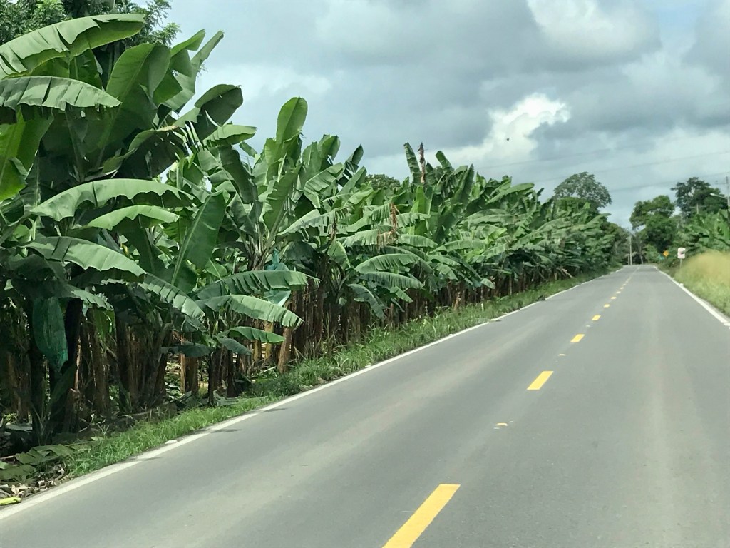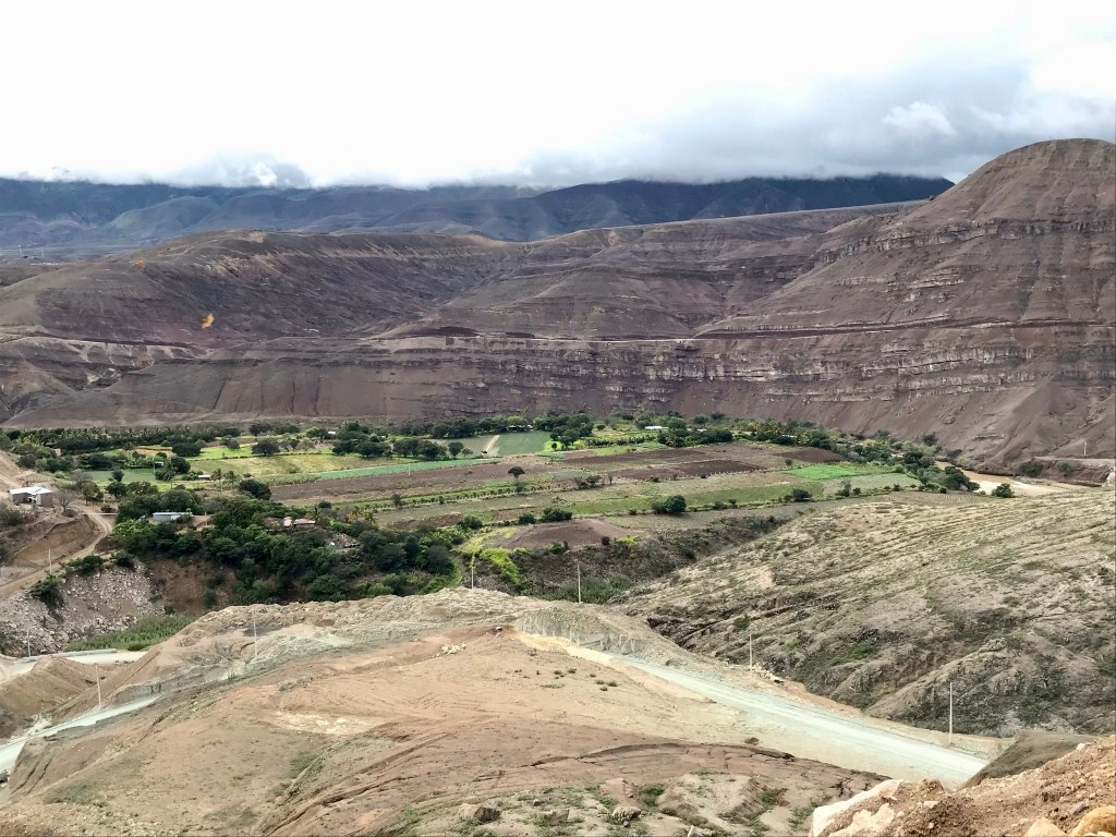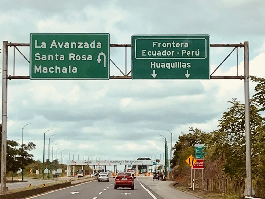 La route vers le sud en direction du Pérou serpente a travers la sierra verdoyante pendant plusieurs heures avant d’entamer une descente assez vertigineuse (passant de 3500 m au niveau de la mer en a peine quelques dizaines de km) pour rejoindre la côte au niveau de Machala (zone de production intensive bananière). La route de montagne passant dans des défilés rocheux pas encore stabilisés offre quelques surprises minérales de taille parfois au beau milieu de la route quand ce n’est pas la route elle-même qui a été emportée !