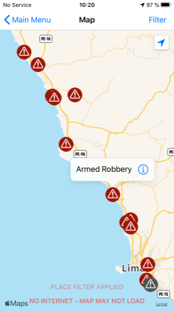 Playa Blanca was a real treasure along a coast that is reputed by travellers to be dangerous in terms of robberies and scams. To give you an example, on the travel application we use, iOverlander, there is a special symbol (red triangle with an exclamation mark) to report warnings to other travellers. This is what it looks like along the northern coast of Peru :