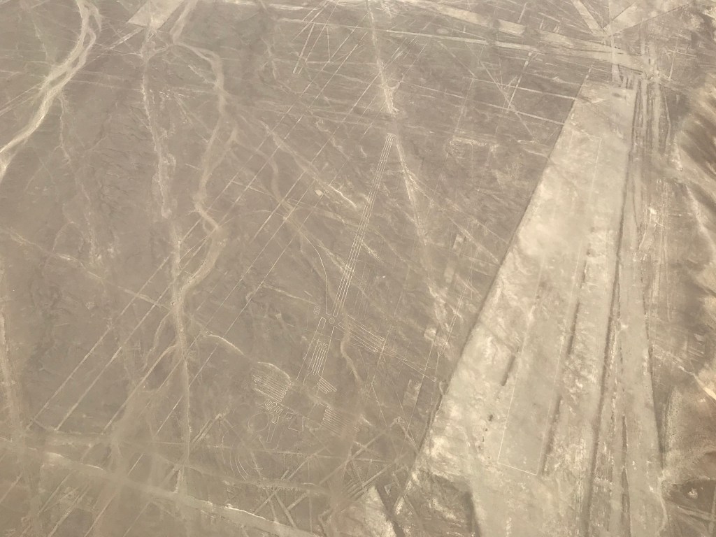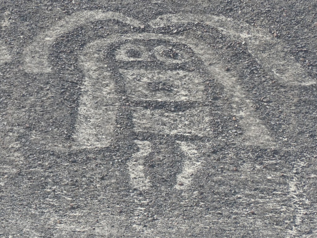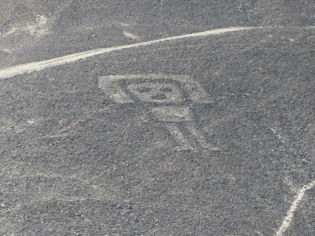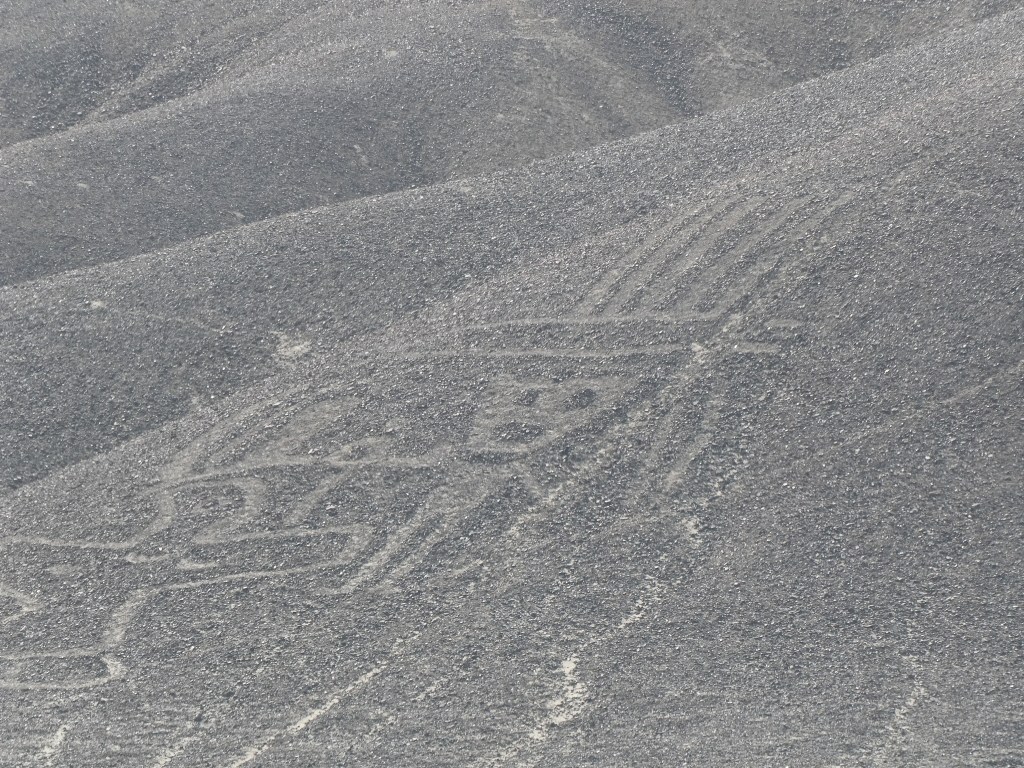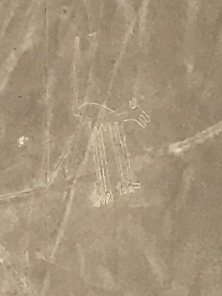 Cela ne nous a nullement empêché d’admirer les nombreuses figures du bestiaire présenté au sol dont : araignée, condor, perroquet, colibri, chien, singe, astronaute, héron, pélican et même un lézard a queue coupée. Ce dernier ayant été amputé lors de la construction de la Panaméricaine ! Une époque où le pays ne se préoccupait pas vraiment de son patrimoine archéologique, ce n’est qu’assez récemment que des mesures conservatoires des vestiges ont été prises. Pour exemple ce n’est qu’après que les ruines des pyramides de Chan Chan aient été très fortement endommagées lors des fortes pluies générées par le phénomène d’El Niño qu’un toit fut installé sur certaines salles.