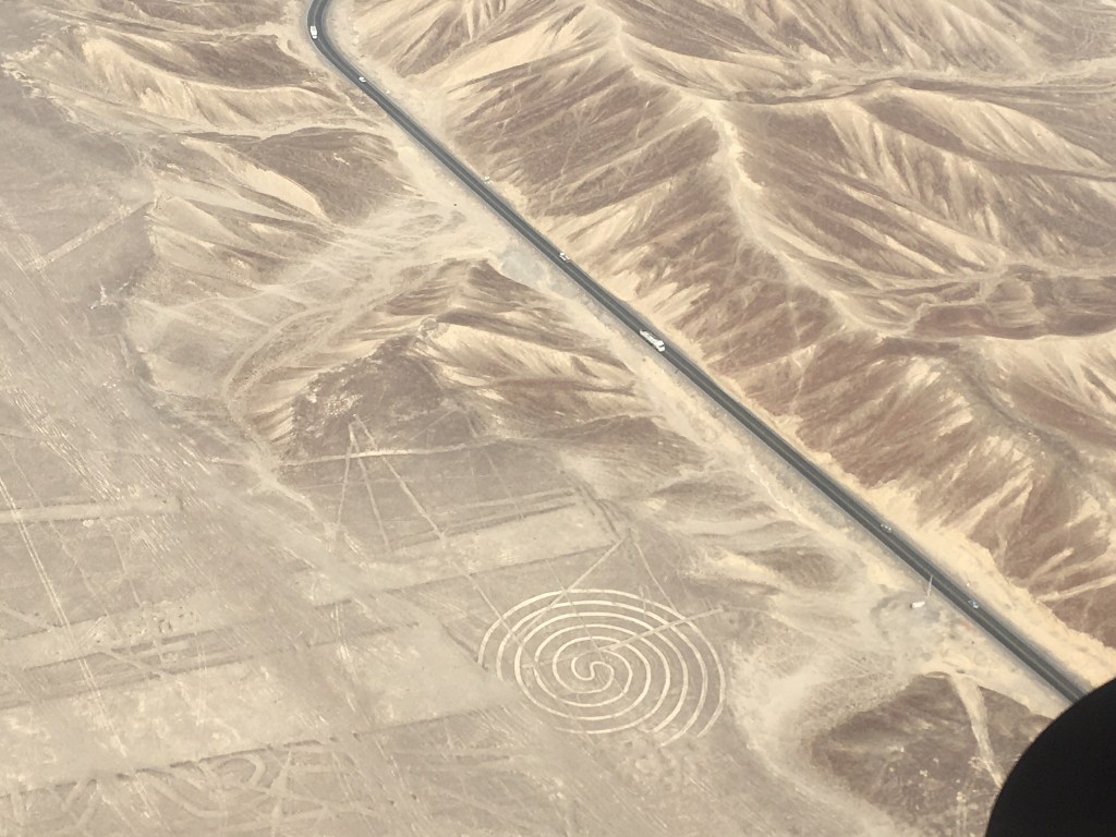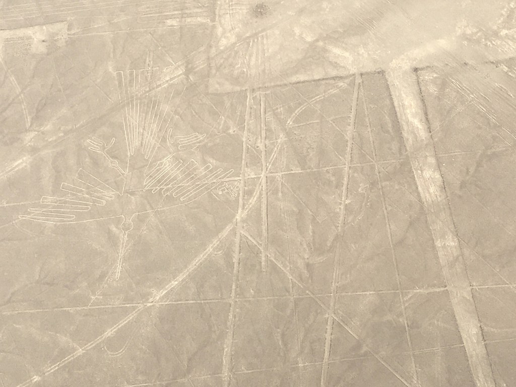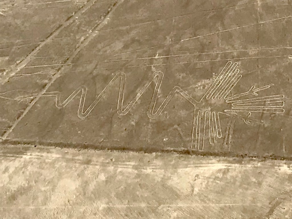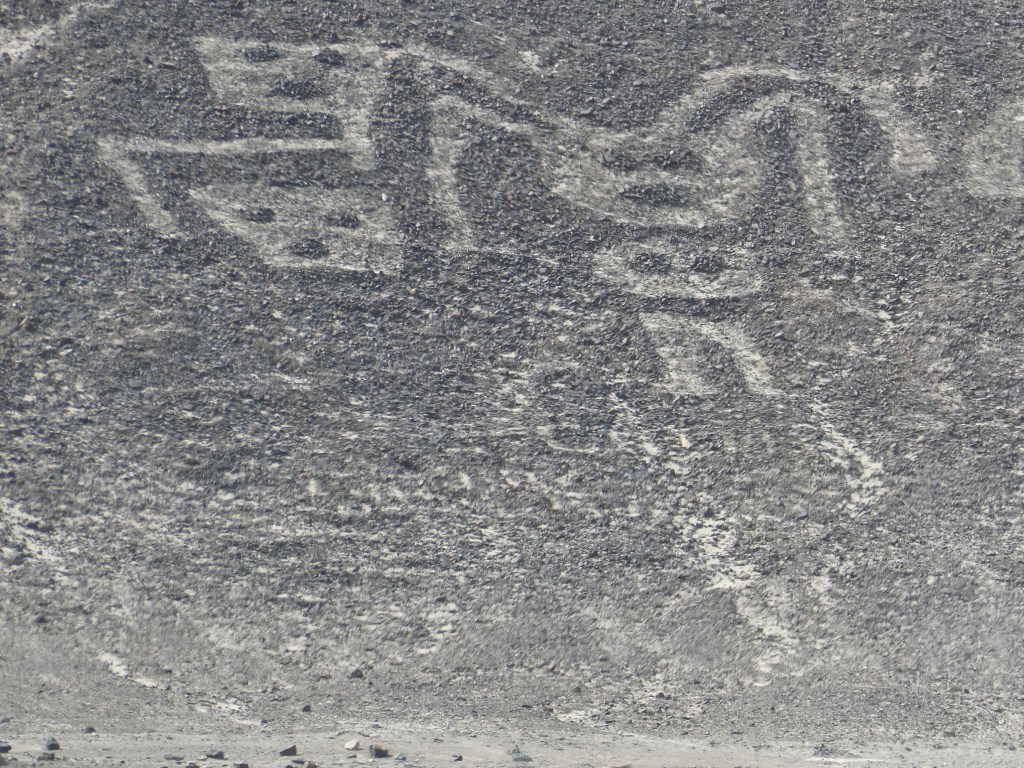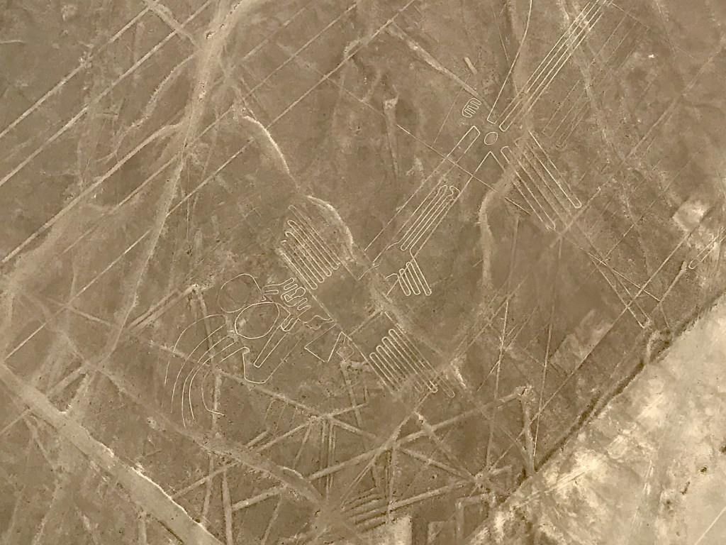 Cela ne nous a nullement empêché d’admirer les nombreuses figures du bestiaire présenté au sol dont : araignée, condor, perroquet, colibri, chien, singe, astronaute, héron, pélican et même un lézard a queue coupée. Ce dernier ayant été amputé lors de la construction de la Panaméricaine ! Une époque où le pays ne se préoccupait pas vraiment de son patrimoine archéologique, ce n’est qu’assez récemment que des mesures conservatoires des vestiges ont été prises. Pour exemple ce n’est qu’après que les ruines des pyramides de Chan Chan aient été très fortement endommagées lors des fortes pluies générées par le phénomène d’El Niño qu’un toit fut installé sur certaines salles.