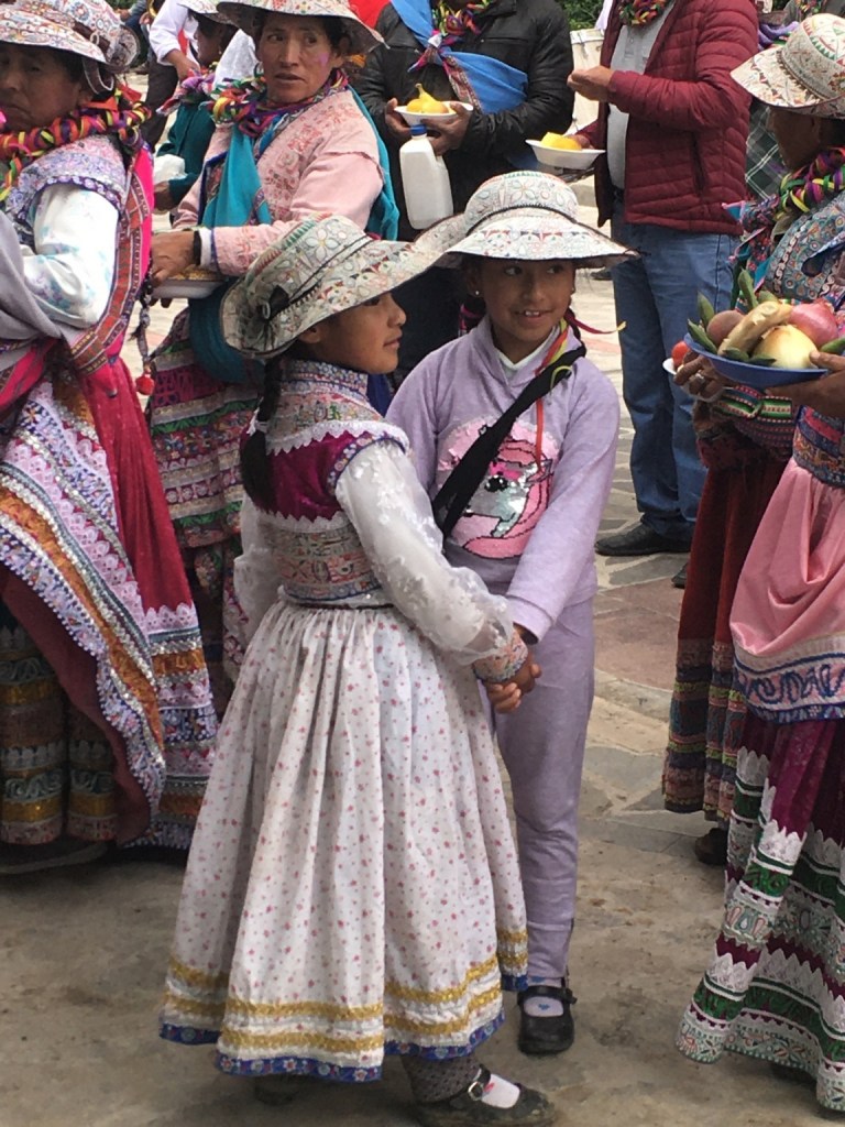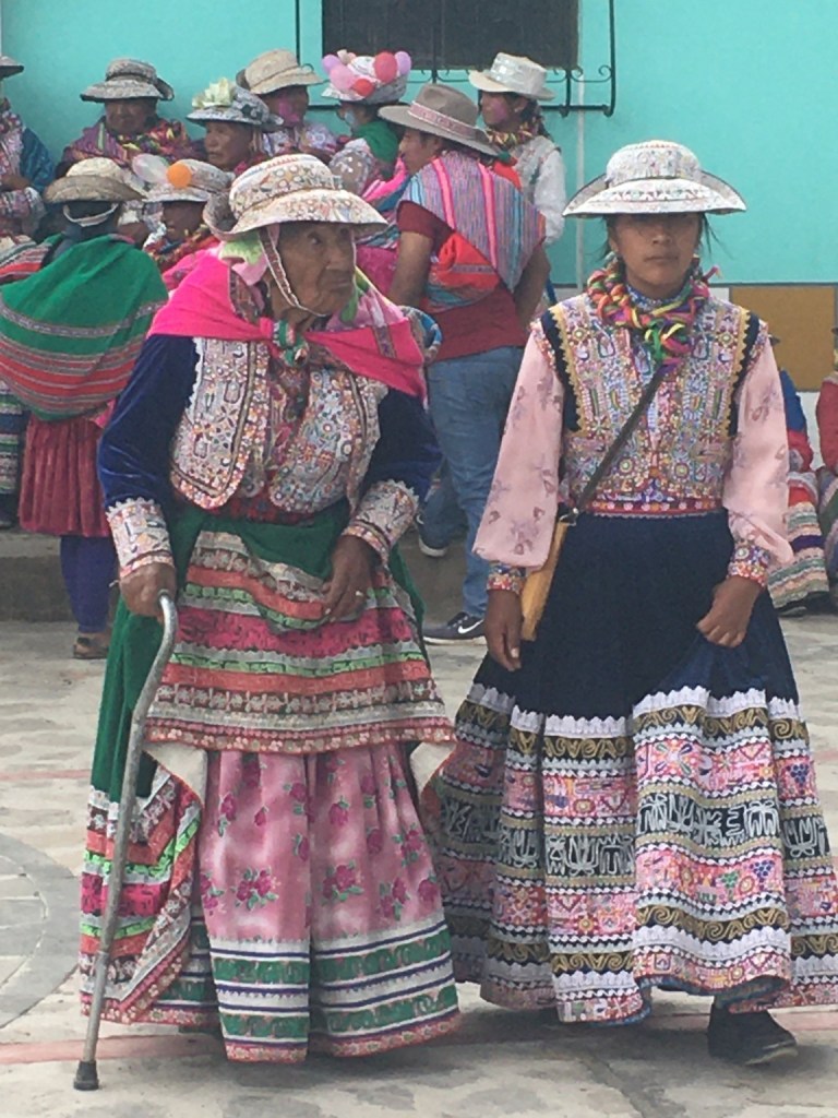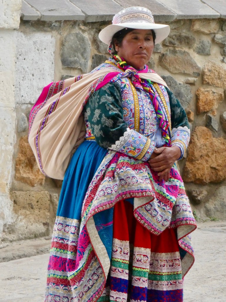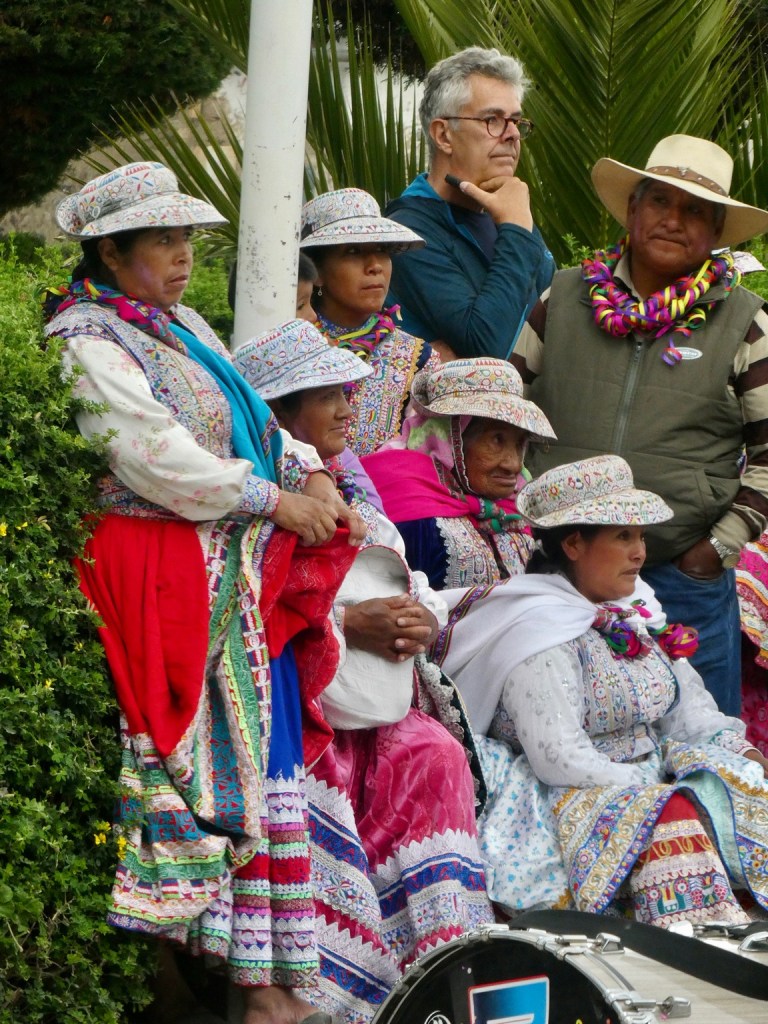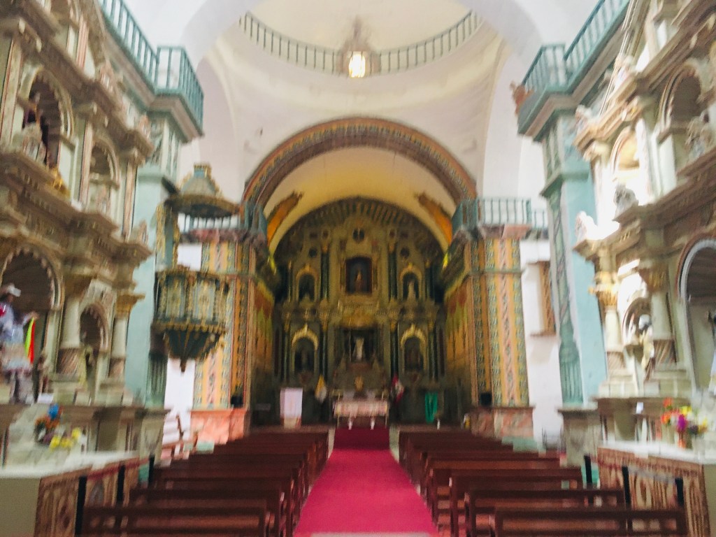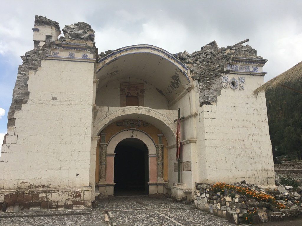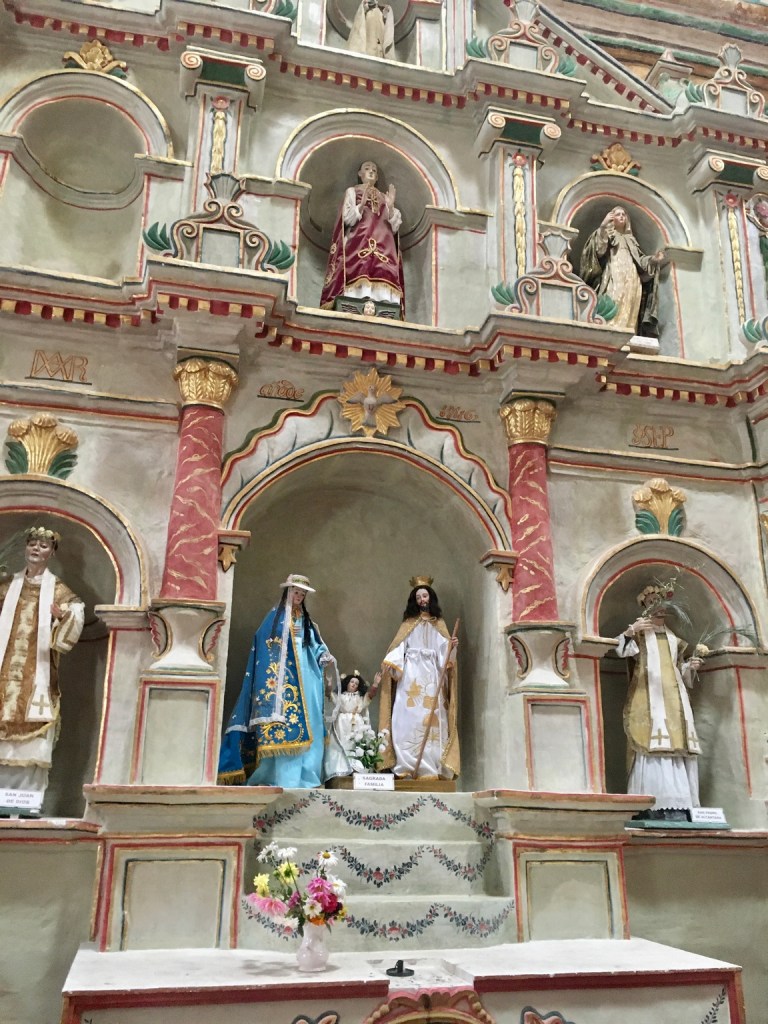 Je vais vous parler de notre visite du canyon de Colca considéré comme le deuxième plus profond canon (3400m) après son voisin de la vallée de Cohasui tous deux beaucoup moins connus que le grand Canyon des Etats Unis. Mais avant d’atteindre ces profondeurs il nous aura fallu passer un col à 5000m (4910 m exactement) et malgré la mastication intensive de feuilles de coca achetées au marché d’Arequipa le comité d’accueil des maux de tête et d’estomac était bien présent ! La route principale longe le canyon d’est en ouest sur le côté gauche, le route la moins fréquentée elle passe à droite, je vous laisse deviner celle que nous avons prise. Des milliers de terrasses occupent les flancs du canyon là où la pente le permet certaines d’entre elles encore visible ont été établies 2000 avant JC avant l’arrivée des Incas. On y trouve beaucoup de maïs, des légumineuses comme la féverole mais aussi de nombreuses variétés de pommes de terre ainsi que de l’oignon, quelques vaches, moutons et lamas complète la production agricole. La route empruntée passe par quelques villages qui portent tous les stigmates du dernier tremblement de terre de 2013 (8.3 échelle Richter) notamment les églises qui pour l’une d’entre elles a perdu ses deux tours, et pour la seconde elle menace tout simplement de s’écrouler. A noter une particularité des églises ici c’est la présence de part et d’autre de l’allée principale d’autels quasi similaires au cœur principal de l’église (voir photo).