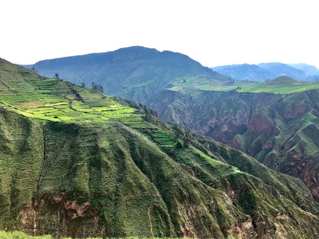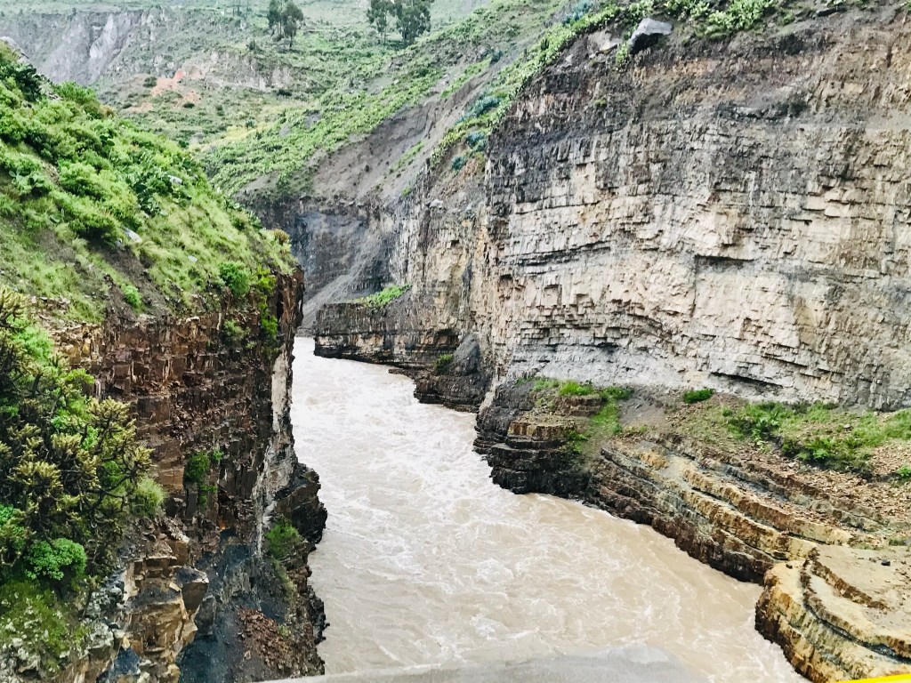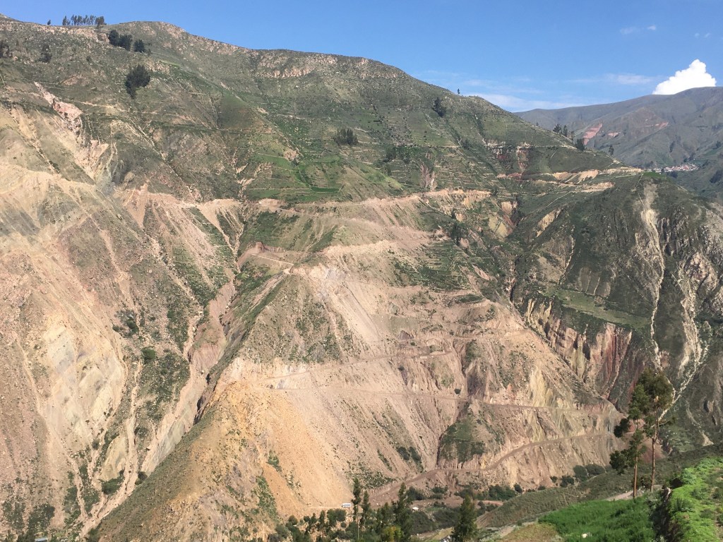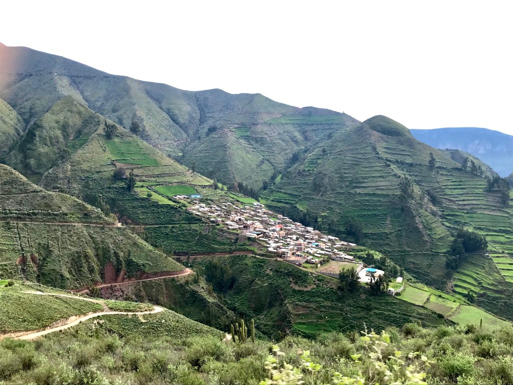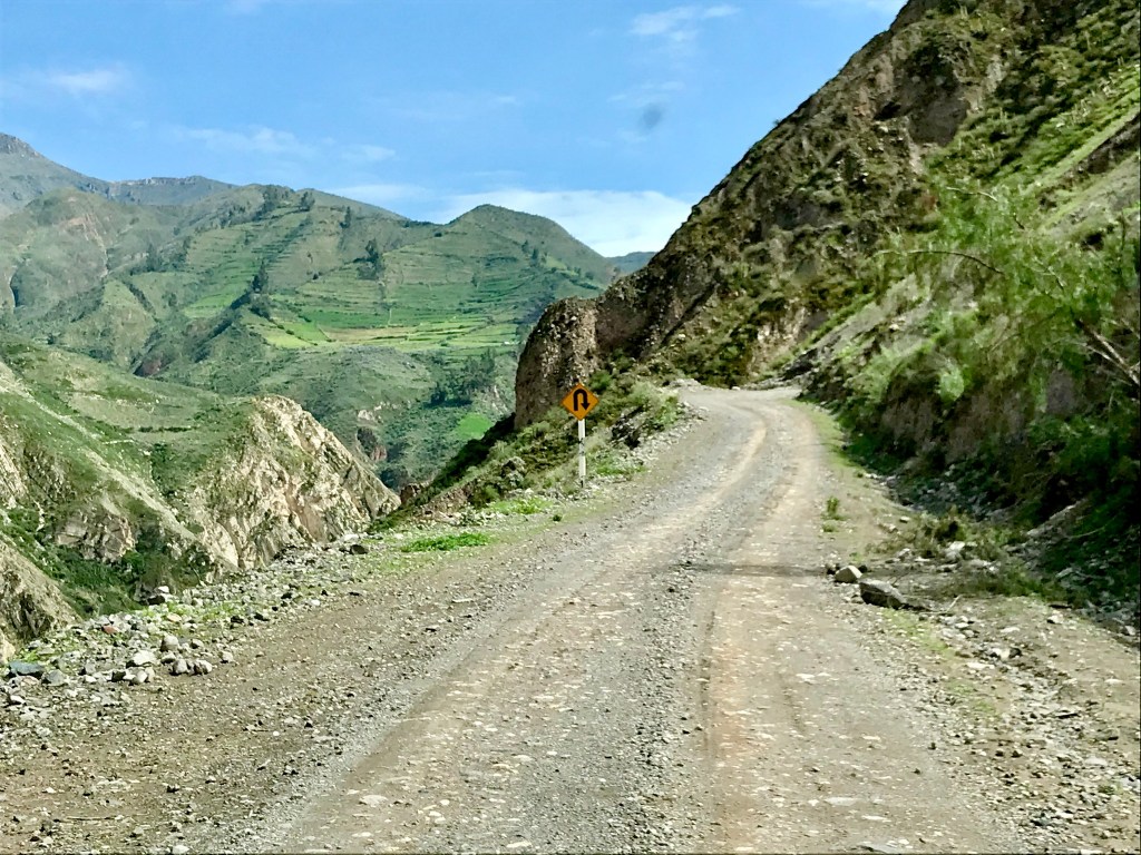 Préférant rentrer sur Arequipa par un autre chemin nous nous sommes décidés pour emprunter une piste de près de 250kms qui nous a fait traverser des paysages magnifiques et passer par des chemins a une seule voie suspendue à flanc de montagne avec des pentes vertigineuses. Les quelques habitants des villages traversés semblaient surpris de notre passage tout en faisant un petit signe de la main en guise de salut.  En cette période de pluies quotidiennes la piste est souvent rendue difficile par les chutes de pierres/rochers ainsi que par la boue particulièrement là où des travaux de déblaiement des éboulis quotidiens ont lieu. Mais les paysages traversés sont tellement beaux qu’on oublie assez rapidement les désagréments de la conduite et notamment la dépose dune roue au milieu de nulle part pour cause d0un bruit soudain sur une roue avant juste avant l’arrivée de la pluie !