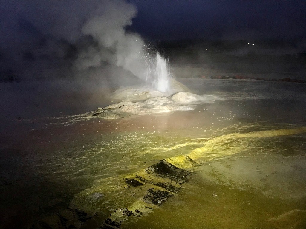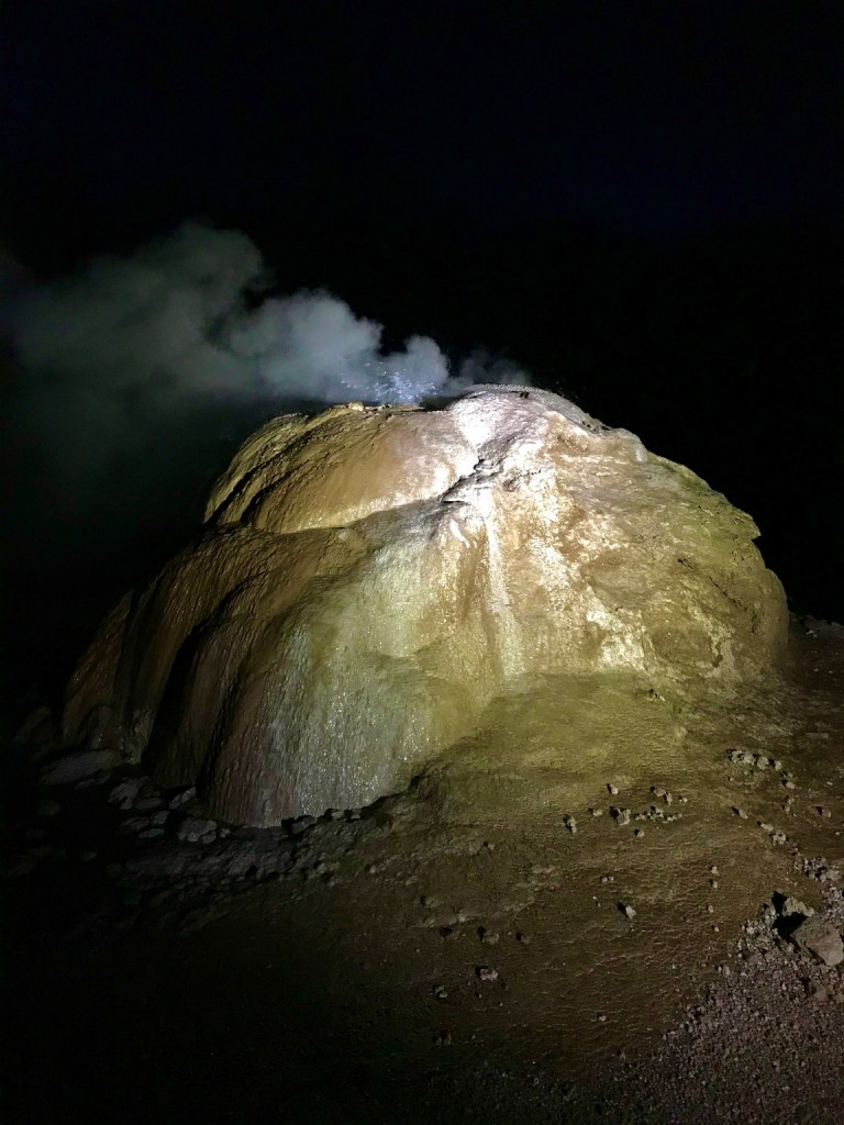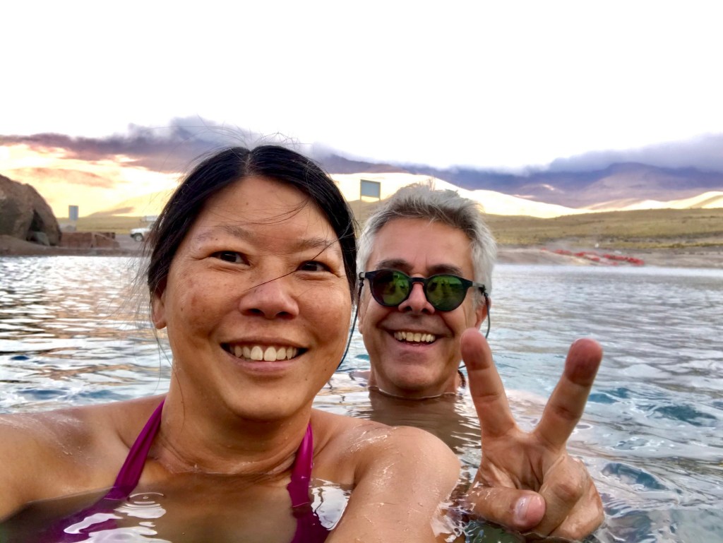 Encore un lieu inscrit dans mon imaginaire grâce à Nicolas Hulot qui nous la présenté maintes fois dans sa fameuse émission télévisée Ushuaïa, je ne pensais vraiment pas qu’un jour je pourrais moi-même au bras de ma compagne parcourir ce magnifique territoire. Ne nous égarons pas, dans le désert d’Atacama il y a le désert et la ville de San Pédro d’Atacama. Si le premier regorge de lieux incroyables, la ville n’offre que peu d’intérêt vu le nombre de touristes qui l’envahissent et donc de facto par la multitude d’agences tout à fait prêtes à accueillir ces derniers avec une extrême bienveillance ! Cette profusion de touristes va bientôt encore être démultiplier par la mise en place de trois vols réguliers hebdomadaire en provenance de Rio de Janeiro lors de la haute saison (décembre à février). Ce qui ressemble déjà beaucoup à la cour des miracles va très certainement devenir un vrai barnum ! Mais concentrons-nous sur le désert, suivant les recommandations de notre guide la « planète esseulée » nous sommes monté à 4300m pour découvrir les geysers de « El Tatio », arrivés vers 17h00 soit bien après que les centaines de minivans soient repartis vers San Pedro nous avons pu profiter seuls de la piscine alimentée par les eaux chaudes desdits geysers. Notre guide nous promettant un moment sublime en assistant au lever du soleil sur lesdits geysers, ayant dormi sur place nous étions absolument certains d’être les premiers à rejoindre les geysers pour assister au spectacle féerique promis, mais c’était sans compter avec la ponctualité légendaire de plusieurs familles de touristes d’outre Rhin. Malgré tout nous étions auprès des geysers bien avant le lever du soleil fin prêt, mais le seul spectacle fût la déferlante de minivans en provenance de San Pedro déchargeant leur cargaison de touristes mal réveillés car brinqueballés sur la piste depuis 4h00 du matin. Vous jugerez par vous-même de l’intérêt de ces geysers sur les photos ci-dessous.