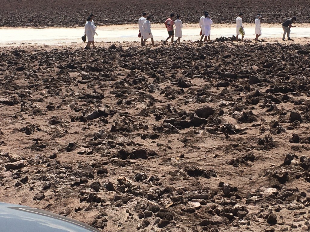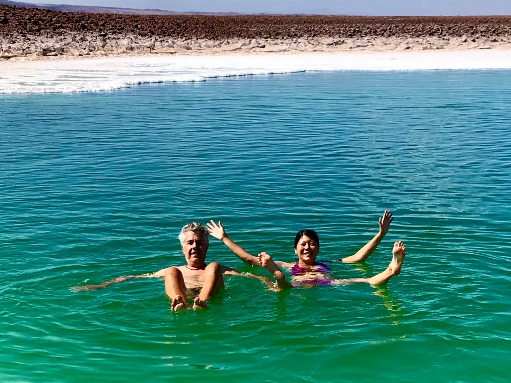 Le lendemain nous avons eut le bonheur de prendre un bain dans une lagune au milieu du salar d’Atacama (laguna de Baltinache). Arrivés tôt le matin nous étions une quinzaine de touristes sur place et nous avons pu profiter des eaux surchargées en sel en toute tranquillité (bien avant la horde des minivans). La concentration en sel est telle qu’il est quasi impossible de se tenir verticalement d’en l’eau par contre on peut sans problème y rester assis. Magnifique contraste du sel blanc, de l’eau bleue transparente et de l’ocre des montagnes en arrière-plan, un seul qualificatif : inoubliable !
